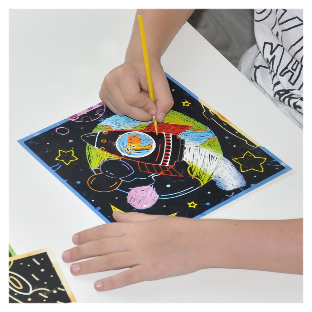 • A fekete réteggel bevont kaparólapok alól színes, látványos képek bukkannak elő minden karcolással, így a kicsik egyedi alkotásokat készíthetnek festék és színes ceruzák nélkül.